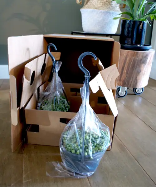 Zelf heb ik de afgelopen jaren meerdere malen online planten besteld bij verschillende planten webshops. En gelukkig is dit tot nu toe altijd goed gegaan. Hieronder zie je foto’s van een bestelling die ik deed bij Plantje.nl. Ik bestelde 2 Senecio’s rowleyanus, want ik wilde graag een mooi hangplantje. Het leuke van online bestellen vind ik altijd het uitpakken, ondanks dat je weet wat erin zit is het toch net of je een cadeautje hebt gekregen. Zoals je ziet word je van de doos alleen al heel blij, met die leuke teksten en plaatjes erop.